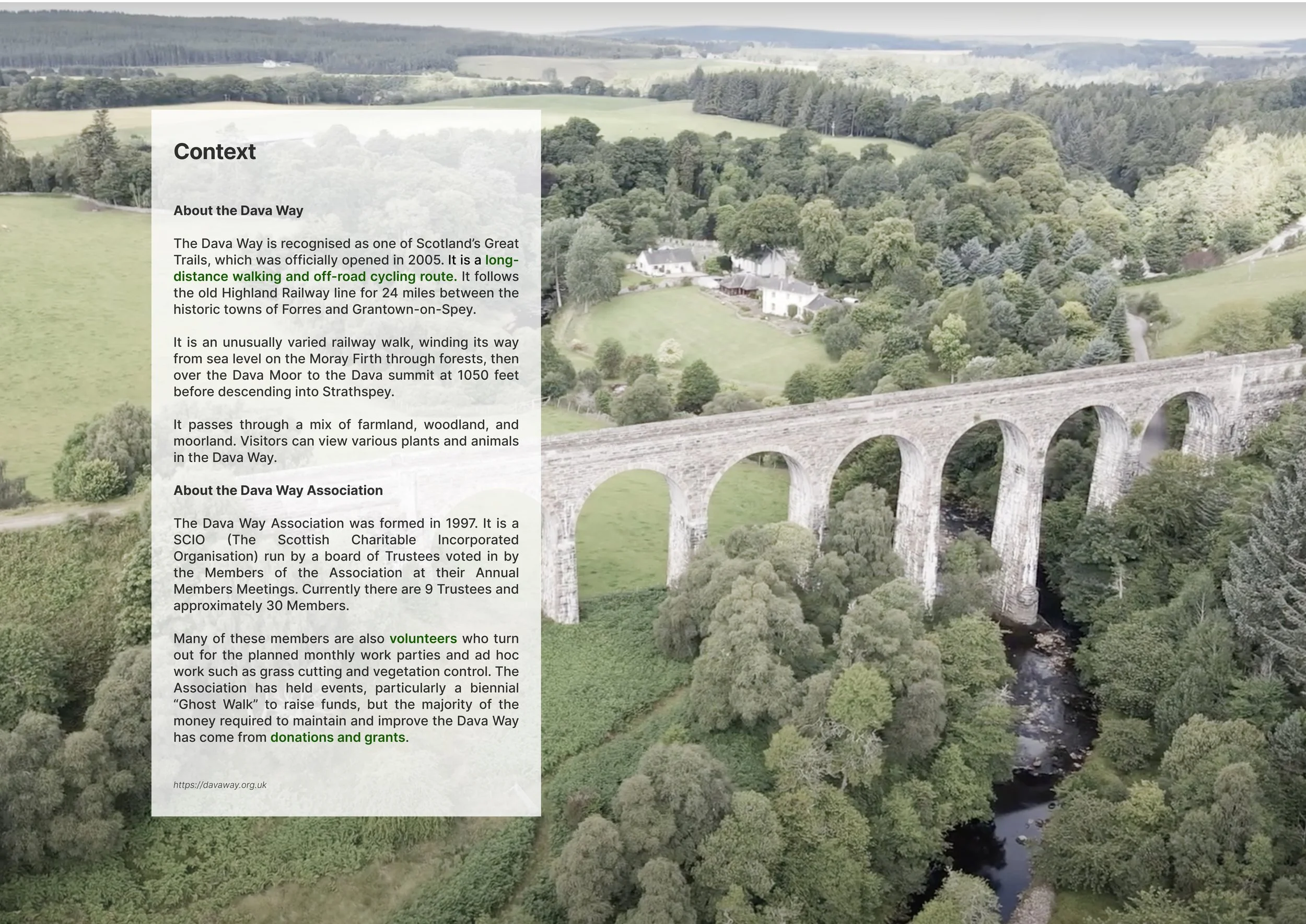 The project collaborates with Forres-based non-profit organization Dava Way Association, aiming to attract more people to use the Dava Way, thereby promoting the trail and addressing long-term issues of funding and volunteer shortages.