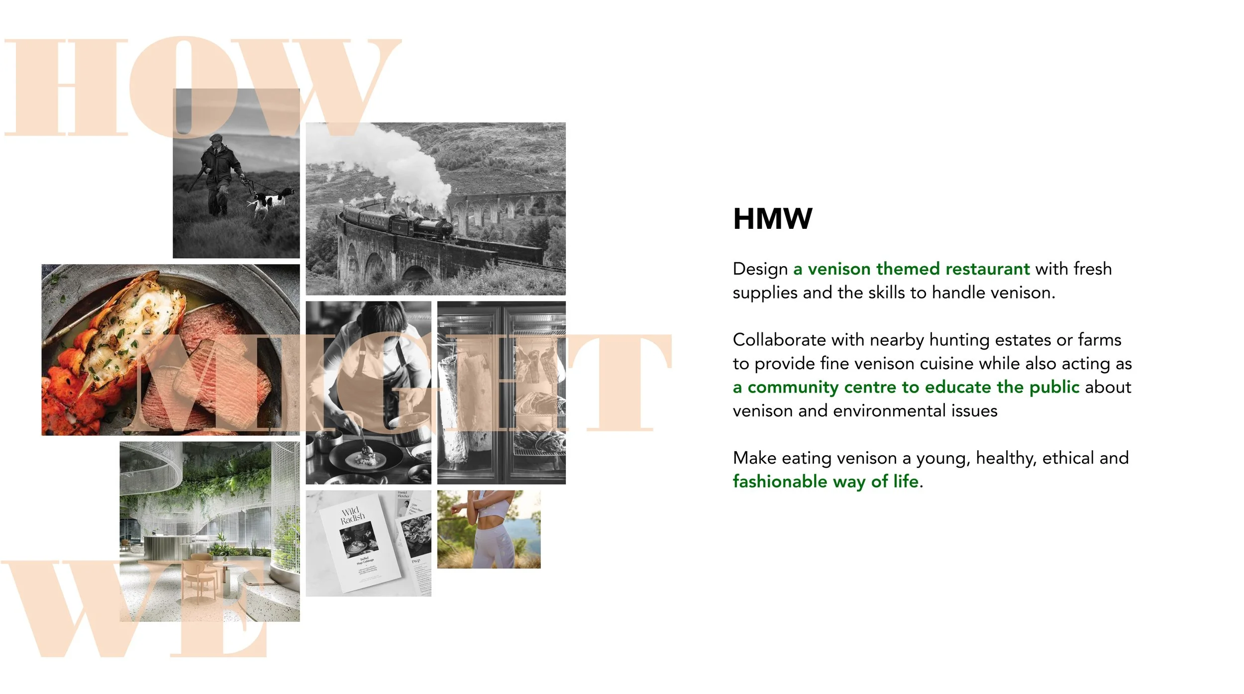 I have designed a venison-themed restaurant to encourage greater consumption of deer meat. Additionally, the restaurant functions as a community centre, using exhibitions to raise awareness of deer overpopulation's environmental and social impacts, aiming to enhance public understanding and engagement.